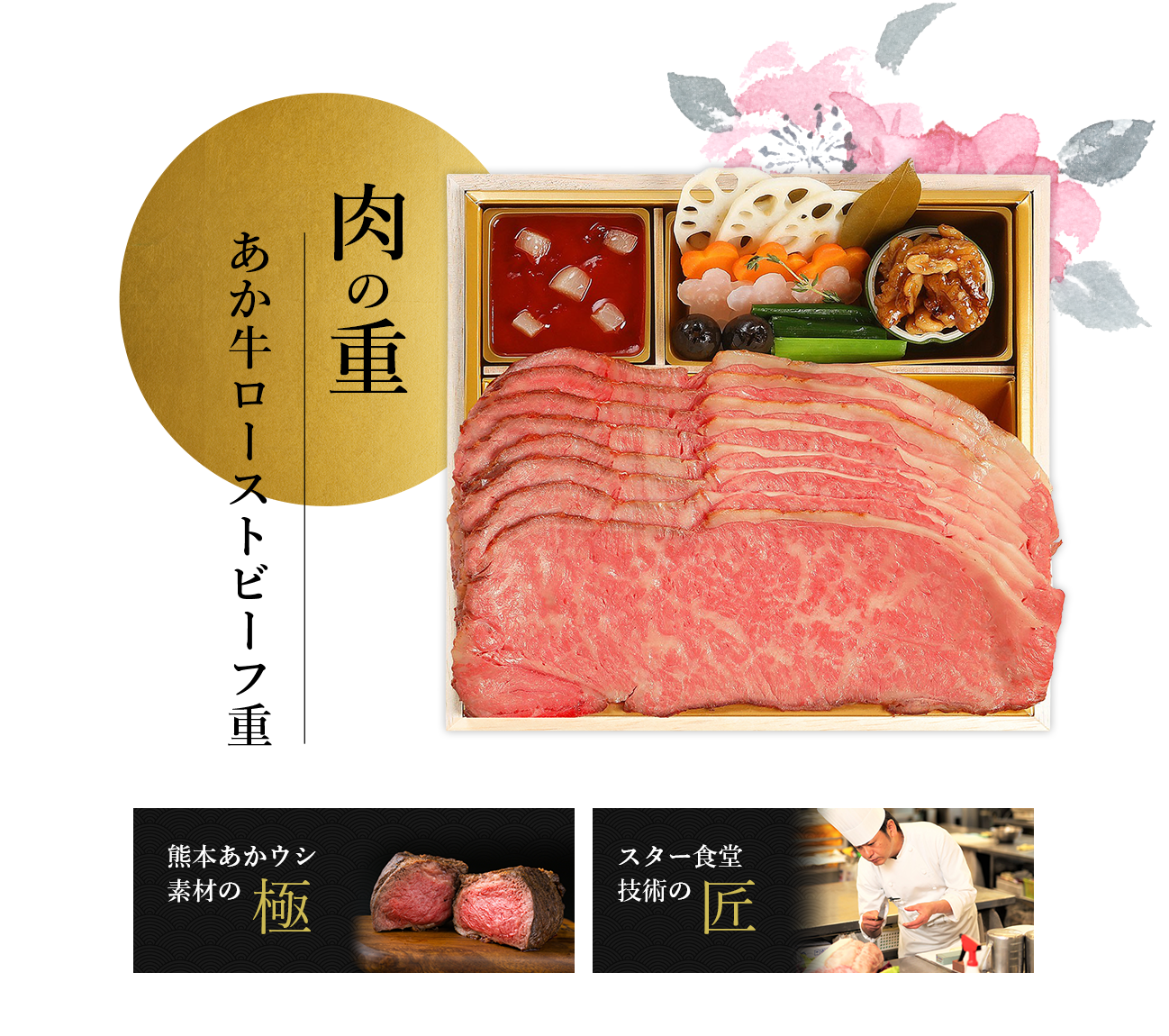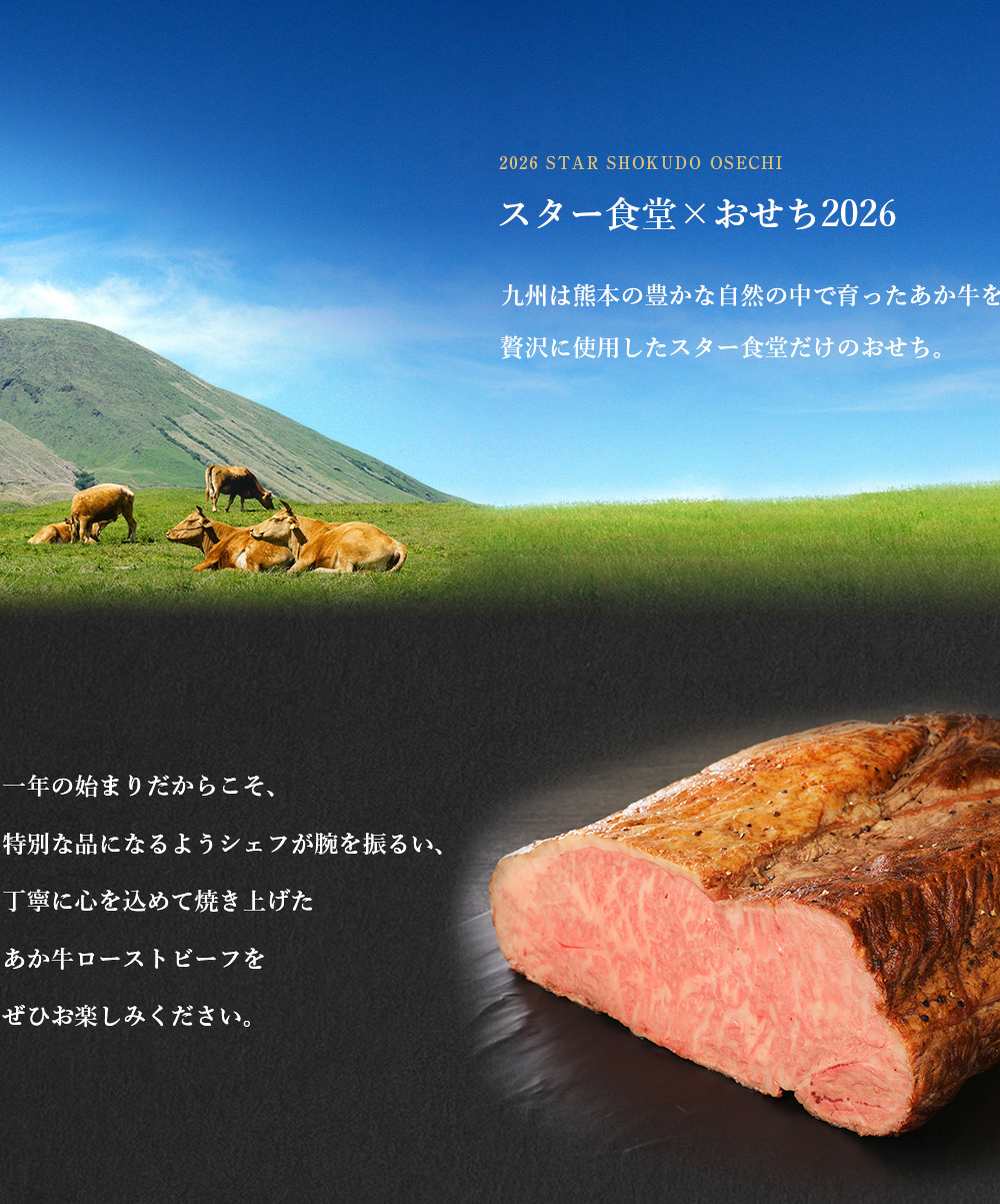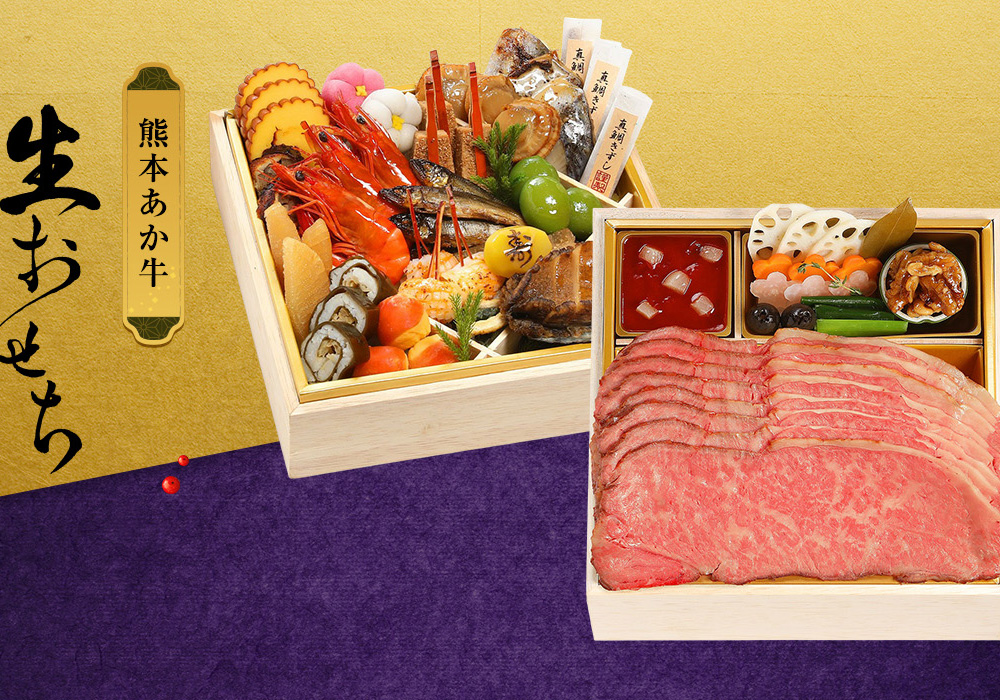 毎年たいへんご好評いただいておりますくまもとあか牛のローストビーフは赤身とサシのバランスが最高で塩のふり方や、焼き加減にこだわることでより一層お肉の風味や旨味を感じていただけると思います。