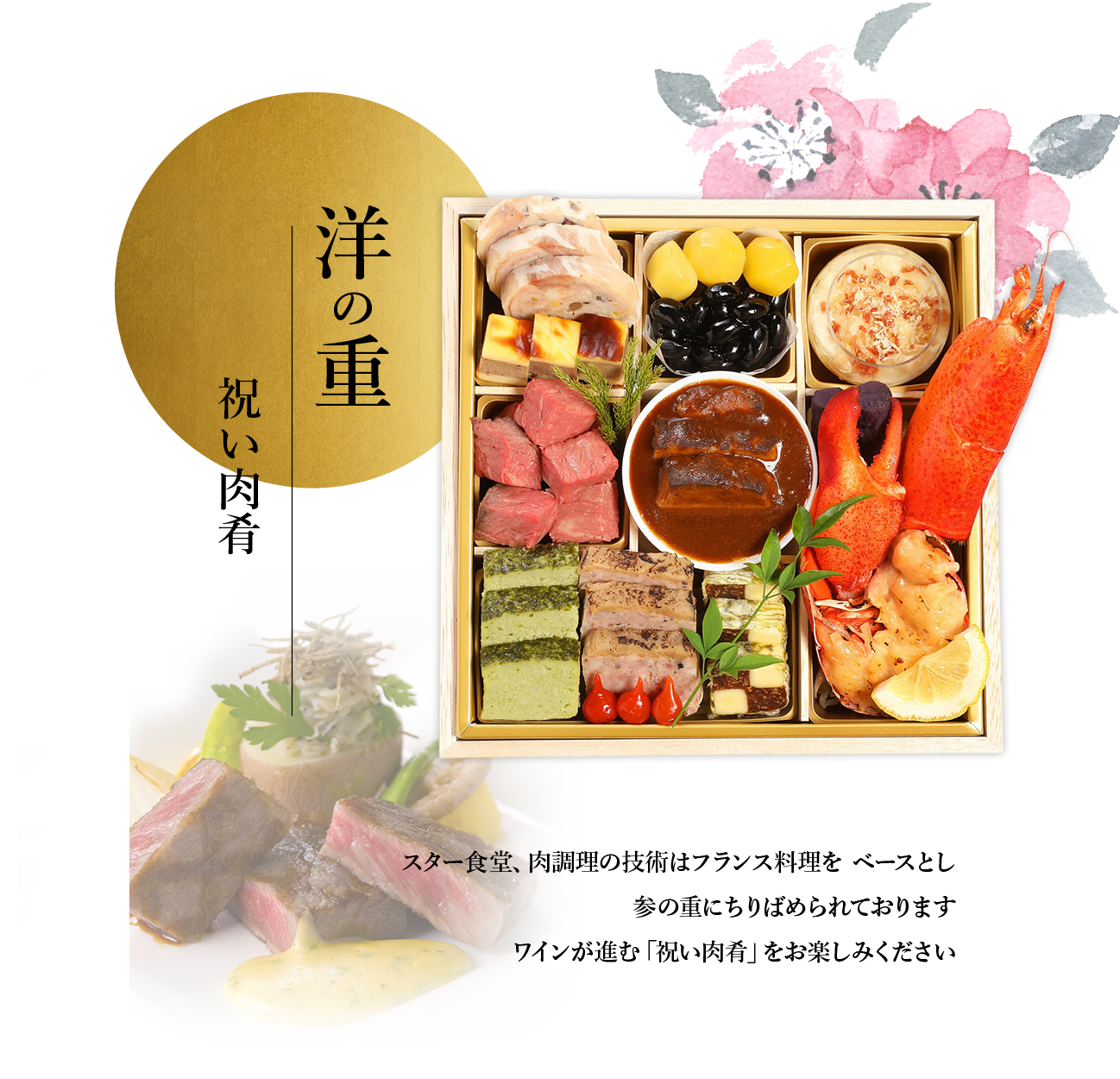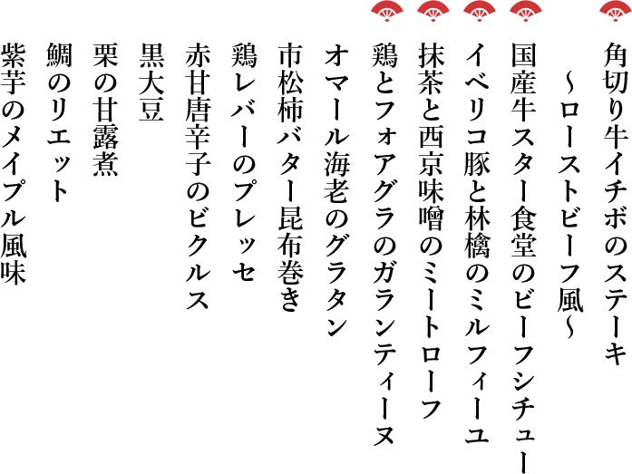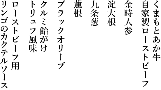 熊本あか牛ローストビーフを始め、オマール海老、フォアグラ、