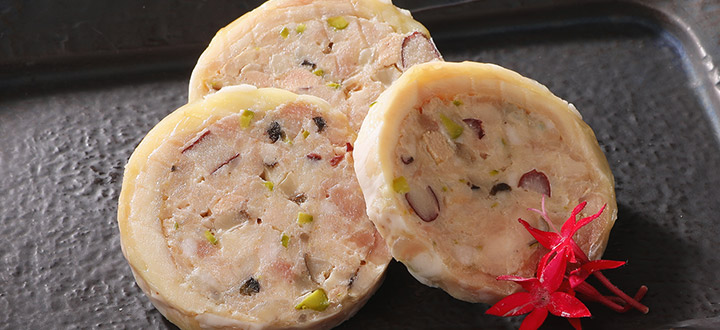 ガランティーヌフォアグラ、鶏挽肉、レッドビーンズピスタチオ、茸等を鶏もも肉で包み込み、さらに、網脂で包み火を通した手間のかかったフランス料理です。